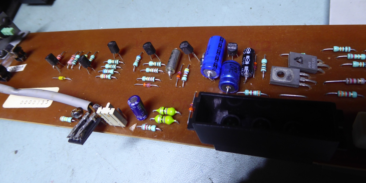 This one is in the top of the shielded cage. I replaced all the electrolytic capacitors. Unfortunately, the audio output connection does not look that nice, as it does not have the female connector part. I do not know if it was because of an earlier repair, or not.